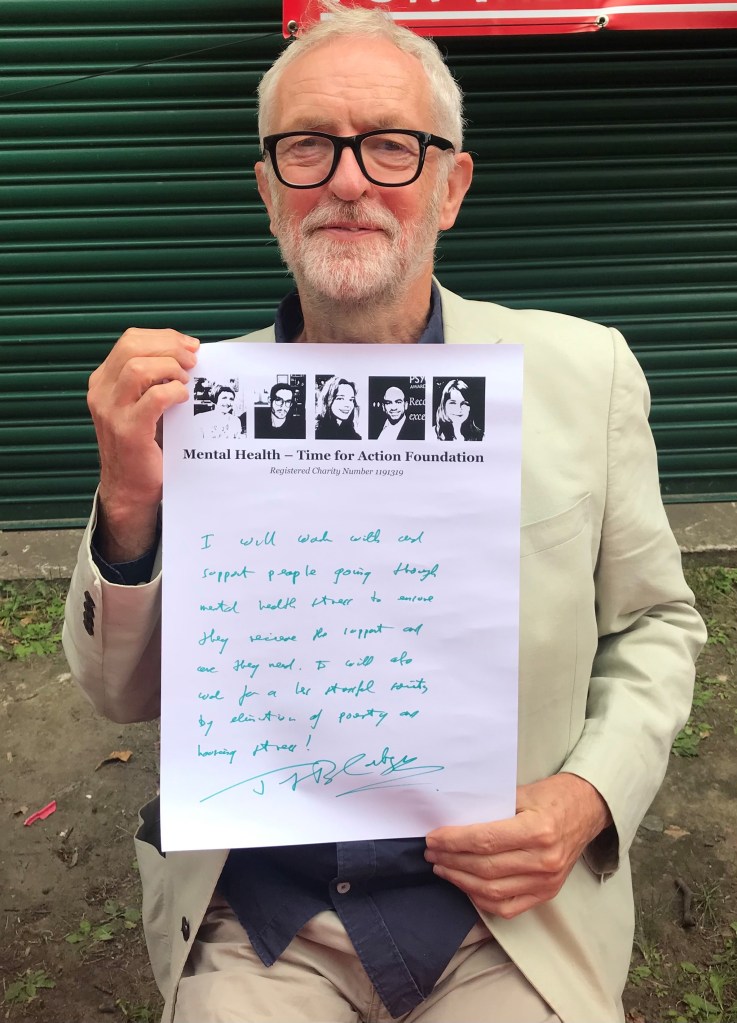 Several prominent MPs support our cause, including Jeremy Corbyn and Caroline Lucas. On 5 September, Jeremy Corbyn MP endorsed our charity and wrote a pledge about his commitment to improving mental health.